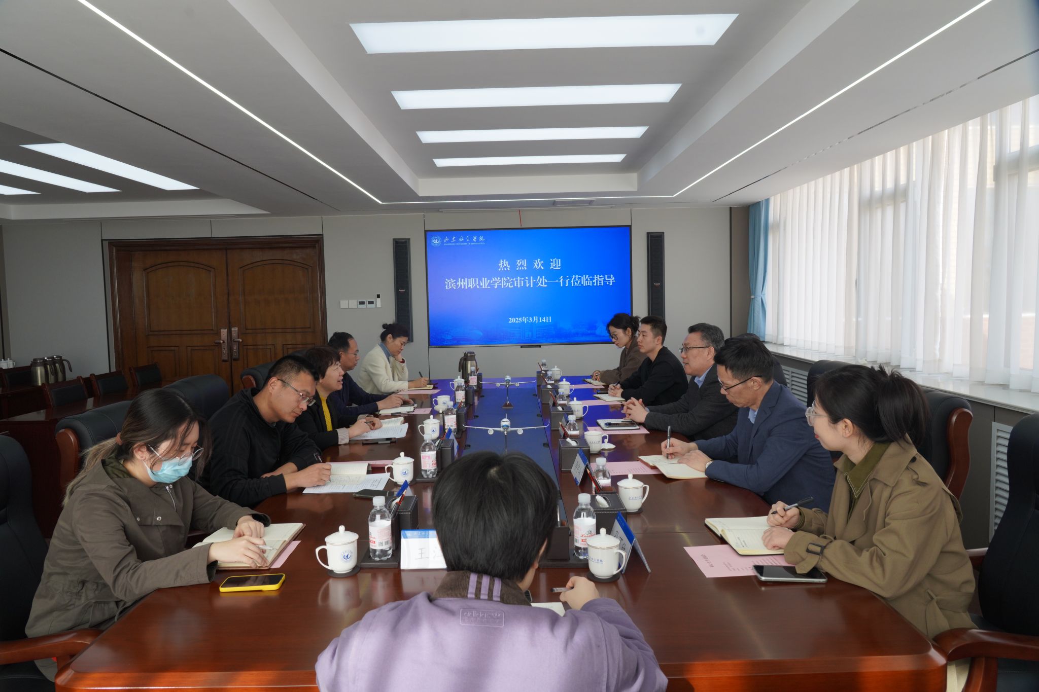 为进一步加强校际合作,学习兄弟院校先进经验,3月14日上午,审计处处长罗殿宏及相关工作人员赴山东航空学院交流学习,山东航空学院审计处处长隆坤及相关人员热情接待。