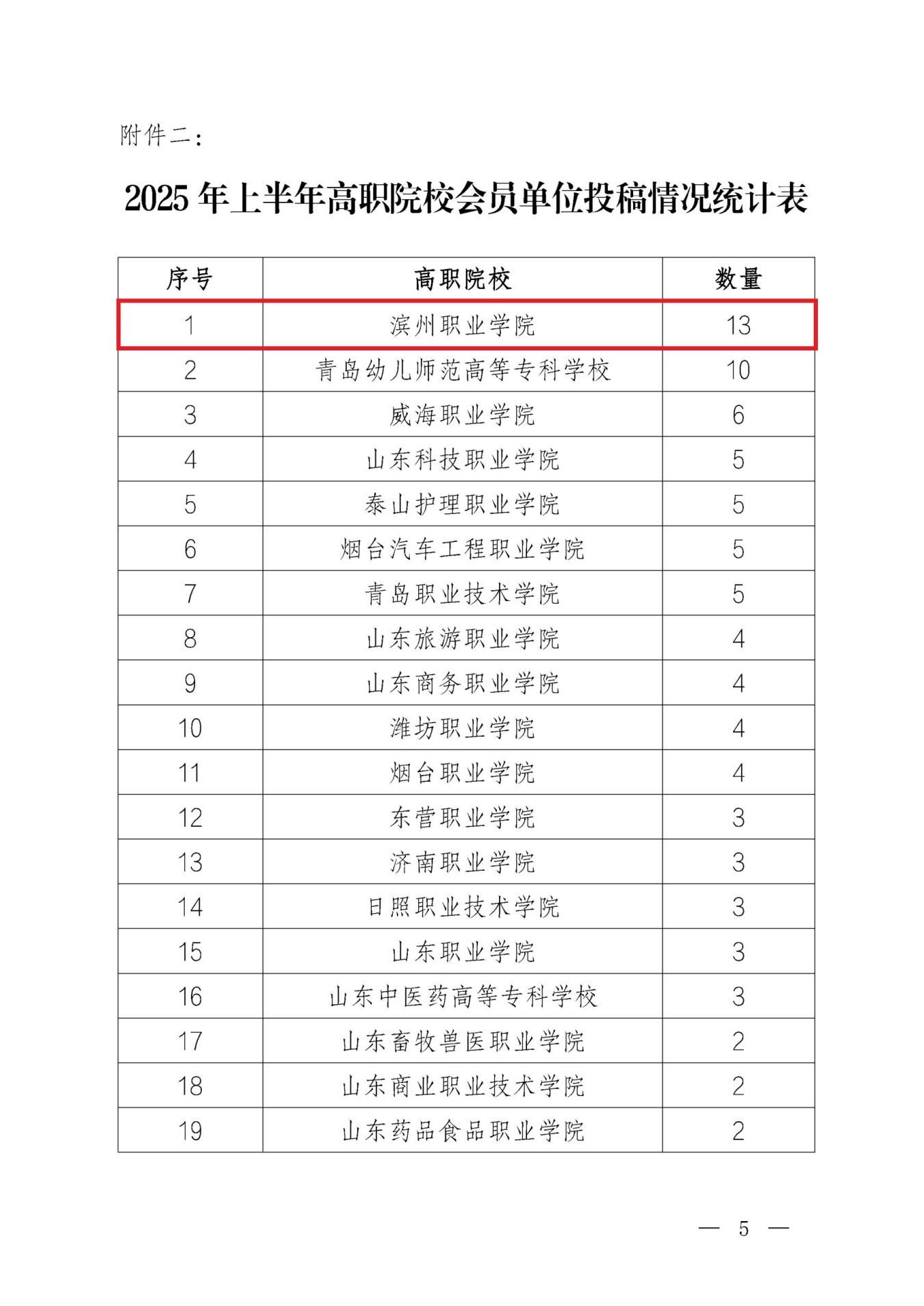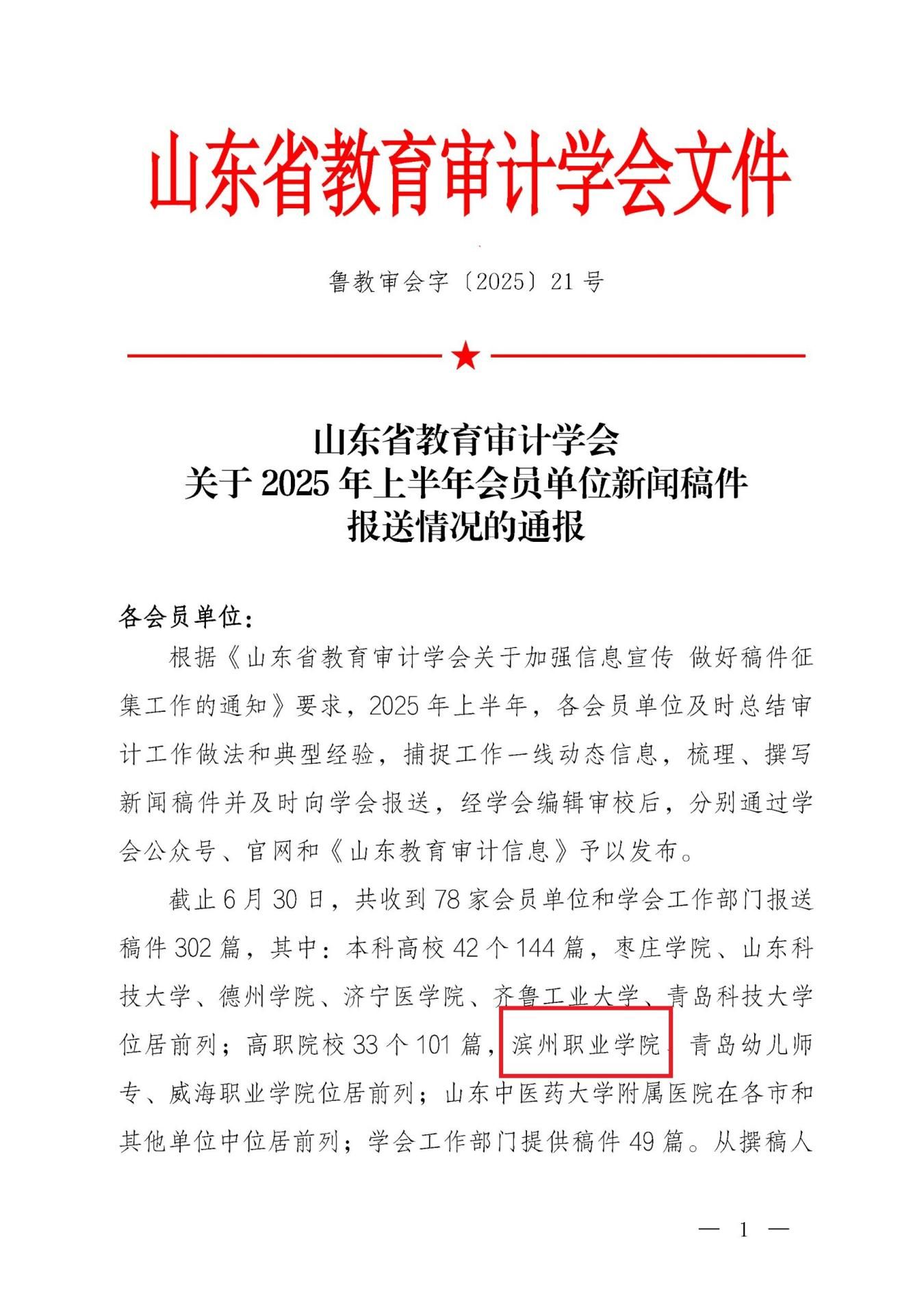 近日,山东省教育审计学会发布《关于2025年上半年会员单位新闻稿件报送情况的通报》(鲁教审会字〔2025〕21号),滨州职业学院在高职院校投稿数量排名中位列第一,信息员位列个人投稿数量第五,展现了审计处在审计信息宣传工作中的扎实成效。
